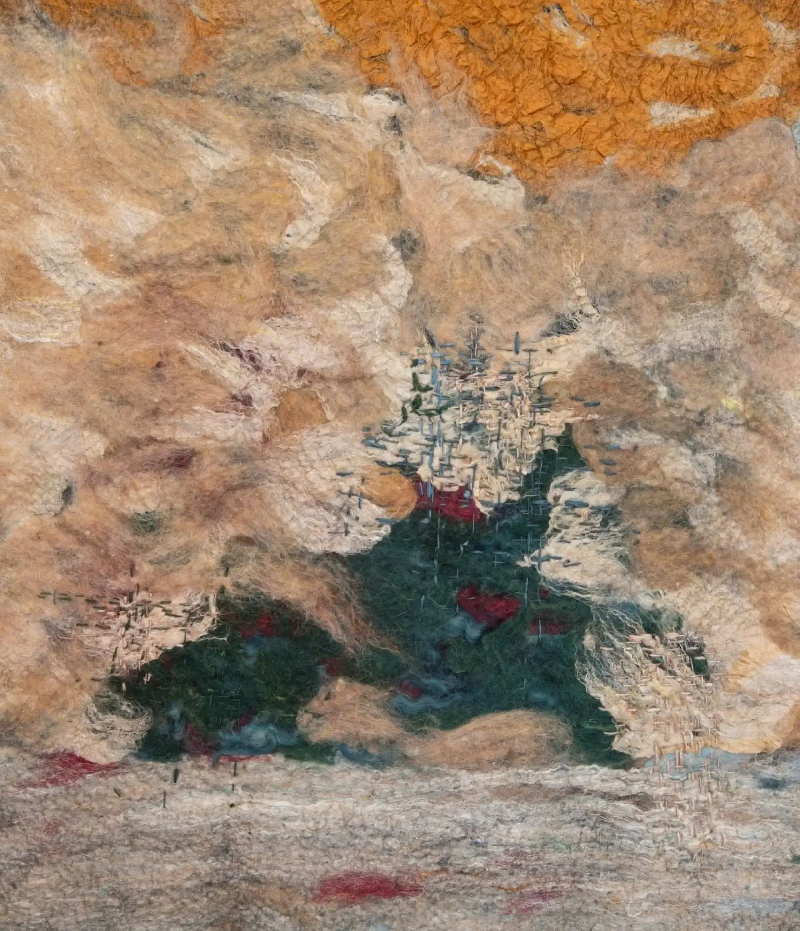 Drenthe Heath sheep’s wool and botanical dye plants grown on her biodynamic farm in Friesland, The Netherlands are transformed into powerful, lyrical compositions through her innovative application of wool felting and plant-based dyeing. At the heart of her work is a commitment to ecological justice, regenerative agriculture, and material integrity.