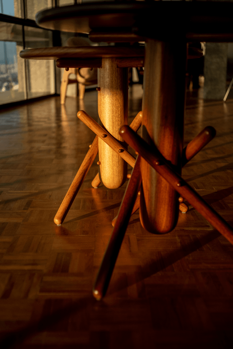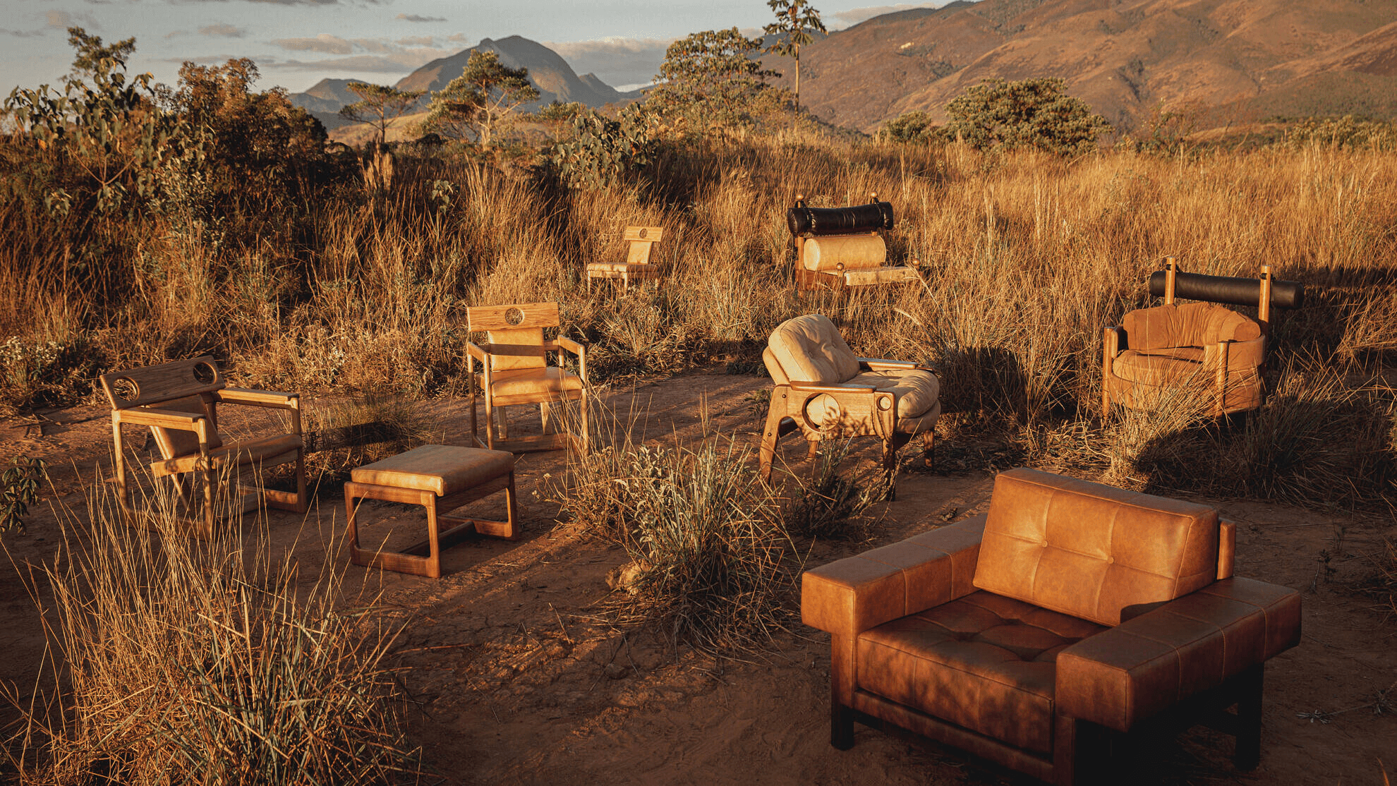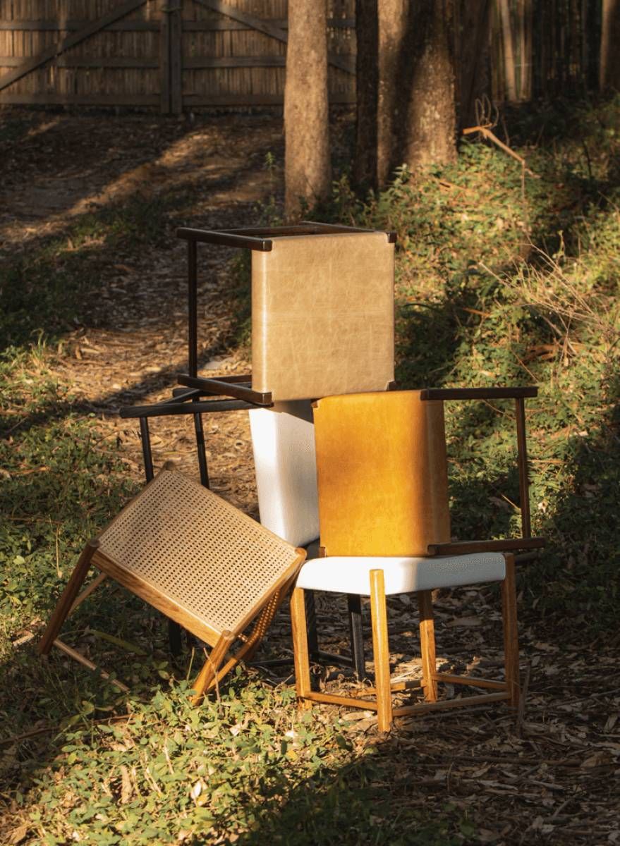 Kilin and Diz chairs, which use sling-like leather or shaped wood elements to create light but expressive silhouettes, balancing structural clarity with a sense of movement.