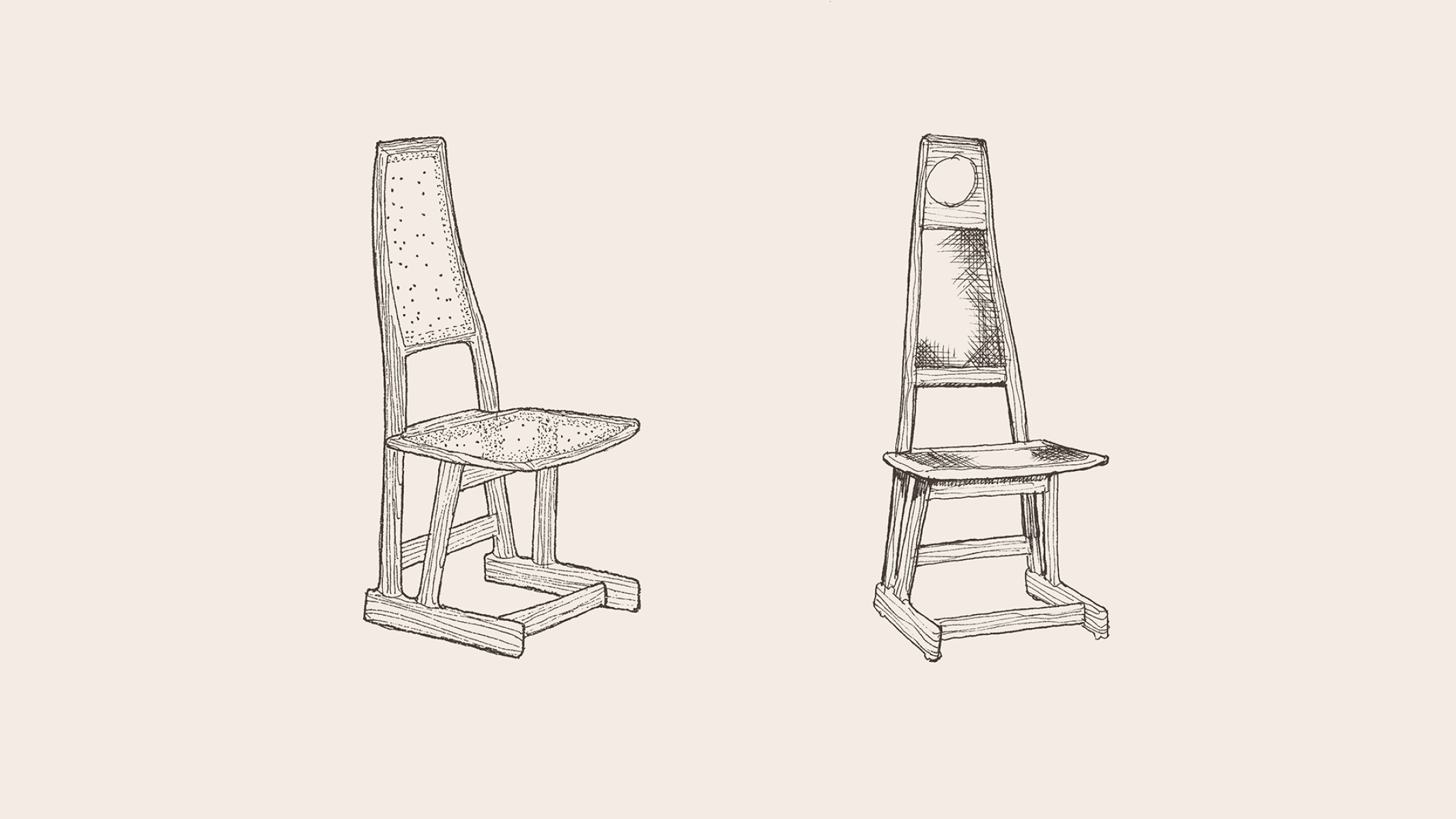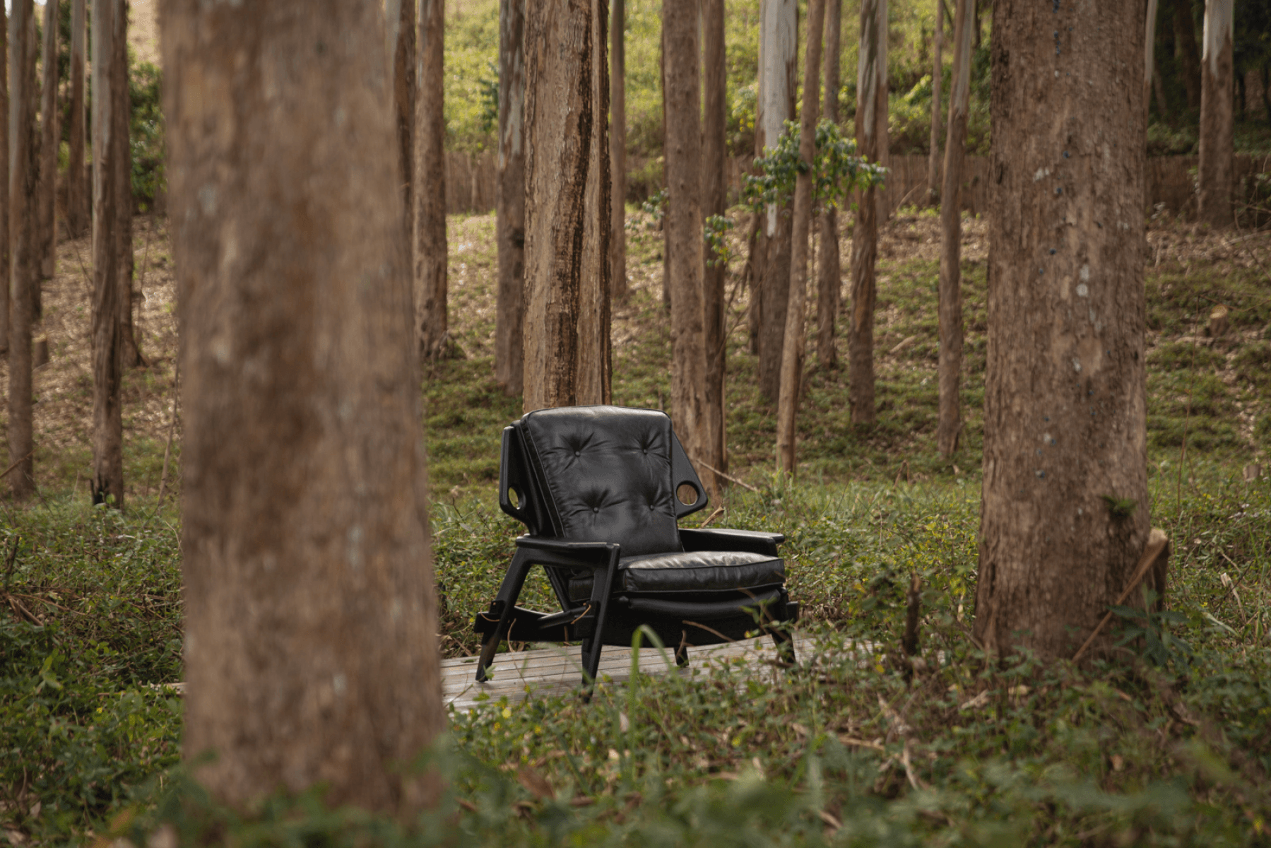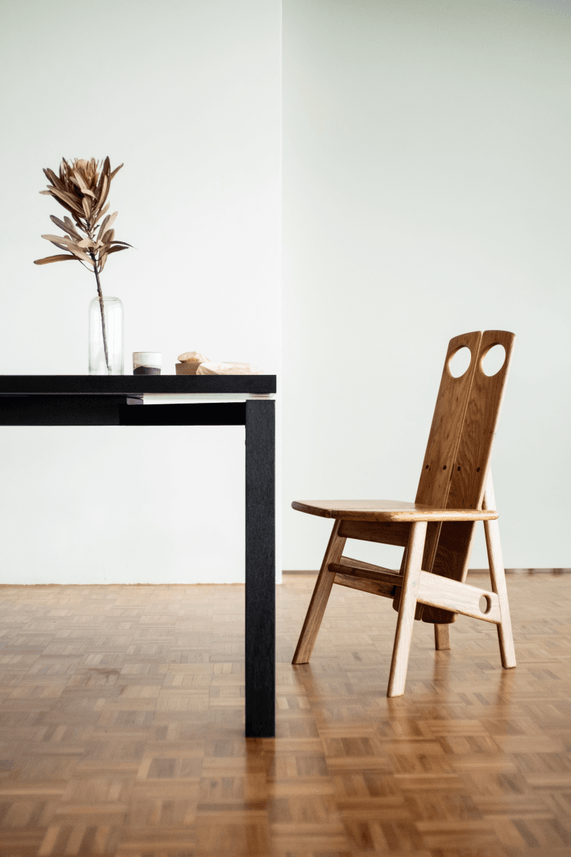 Kilin and Diz chairs, which use sling-like leather or shaped wood elements to create light but expressive silhouettes, balancing structural clarity with a sense of movement.